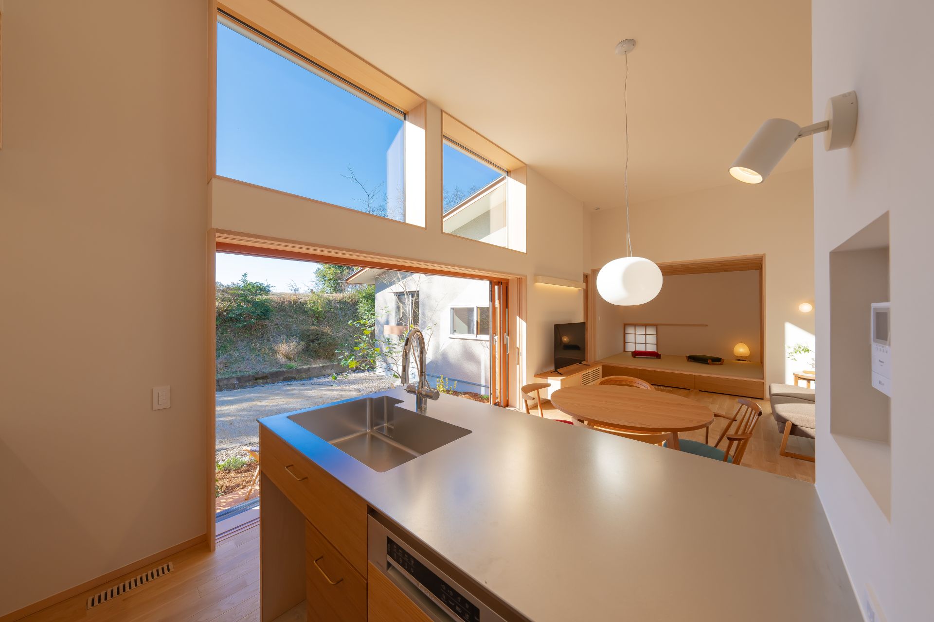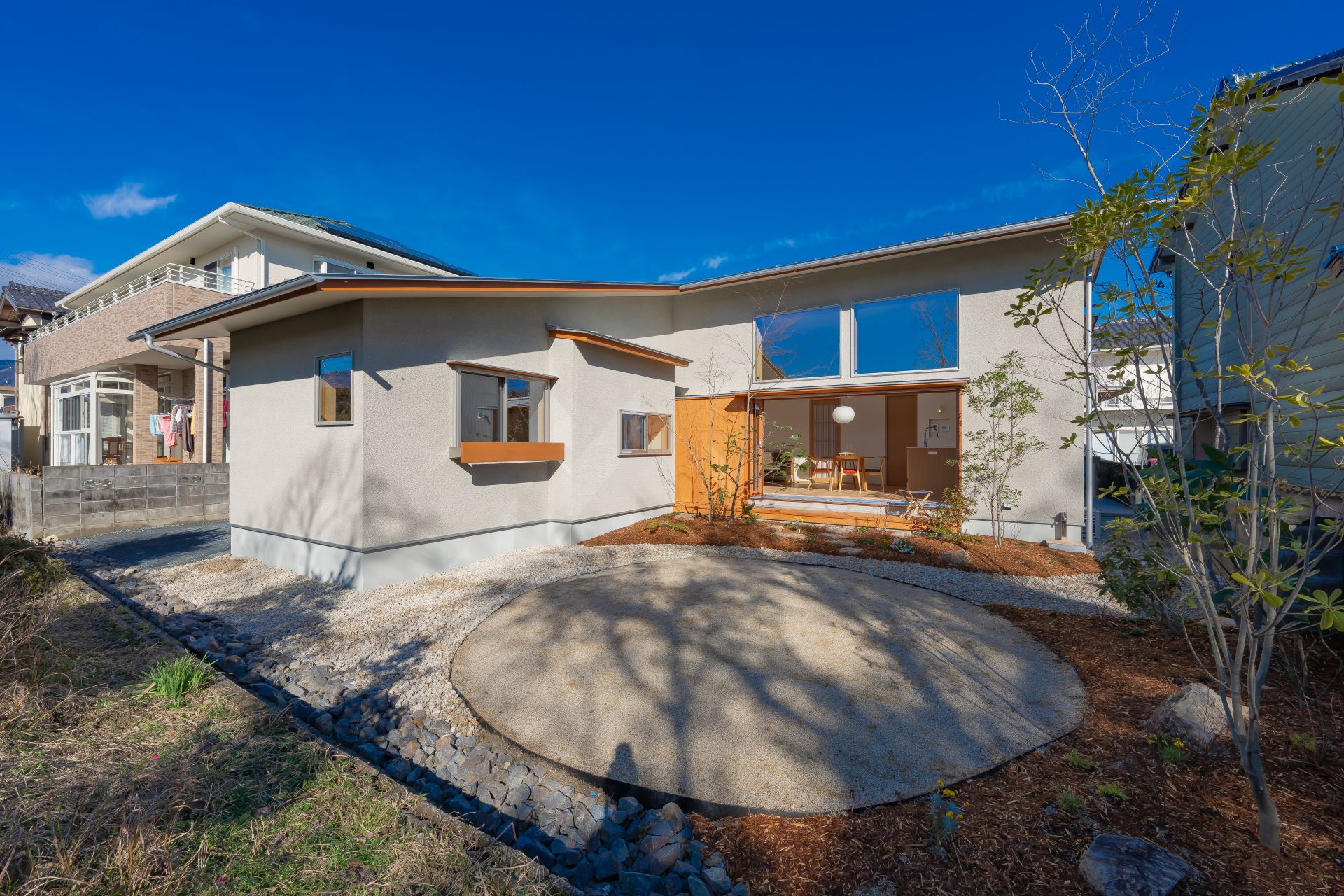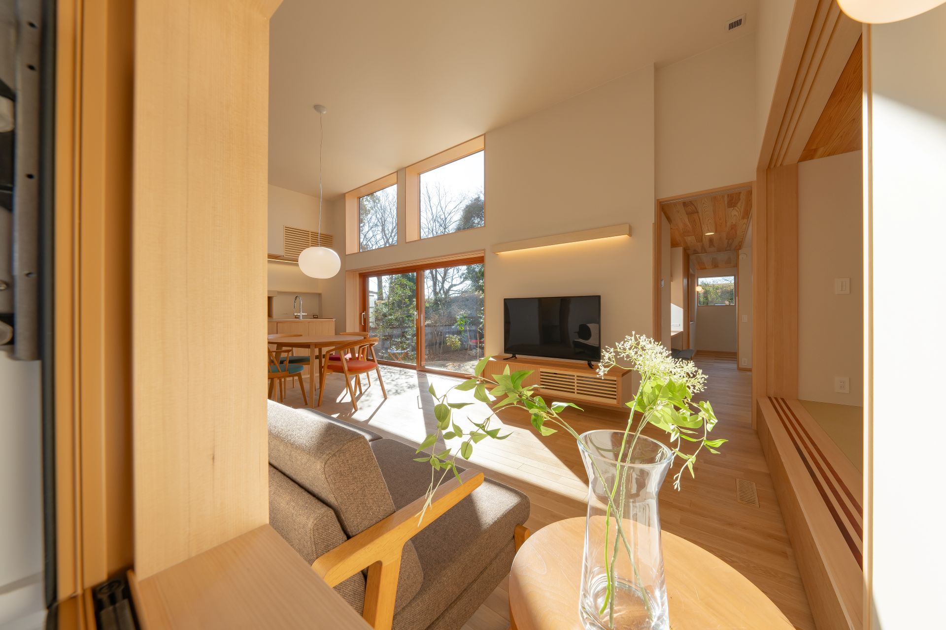 庭と繋がる開口の木製サッシの採用や、メリハリのある空間設計により、23坪とは思えない広々とした太陽光を活用できる空間設計に加え、床下エアコン、4.98kWの太陽光発電容量の他、