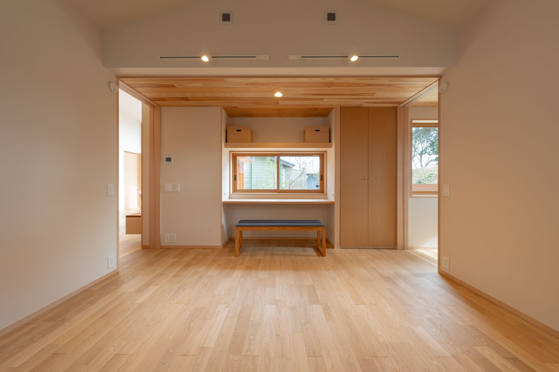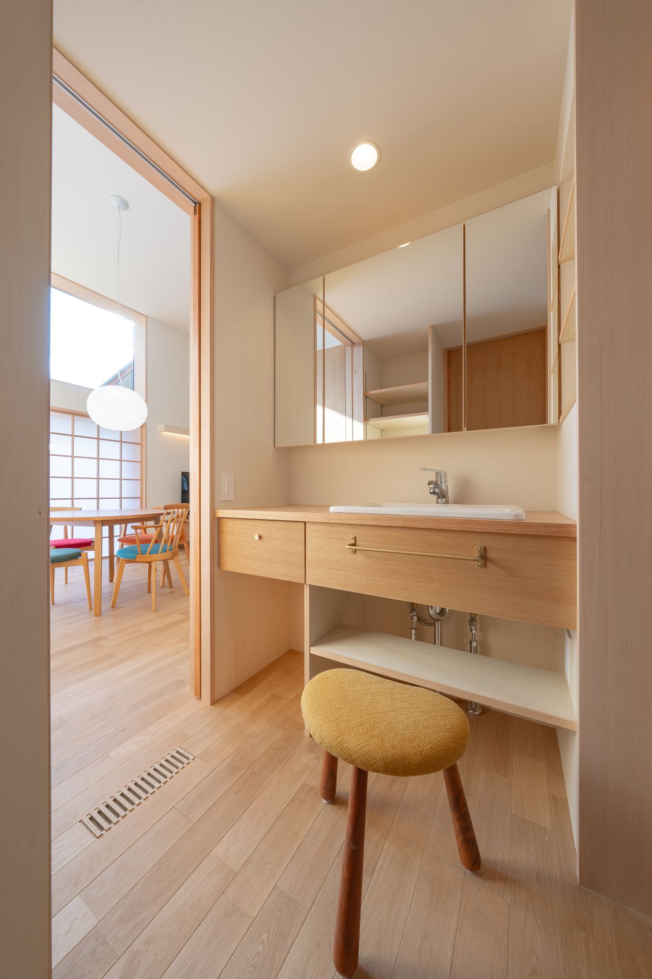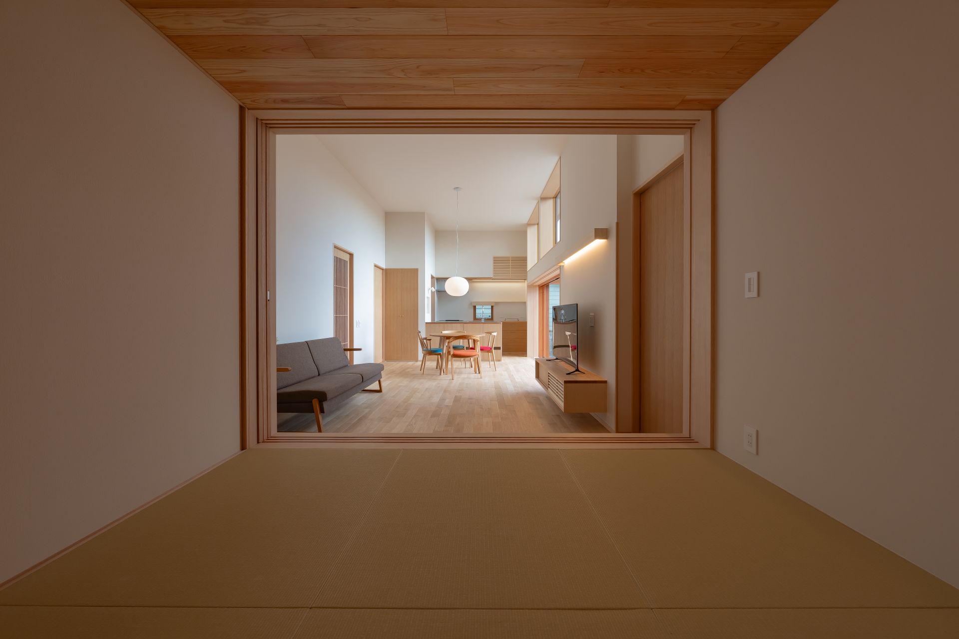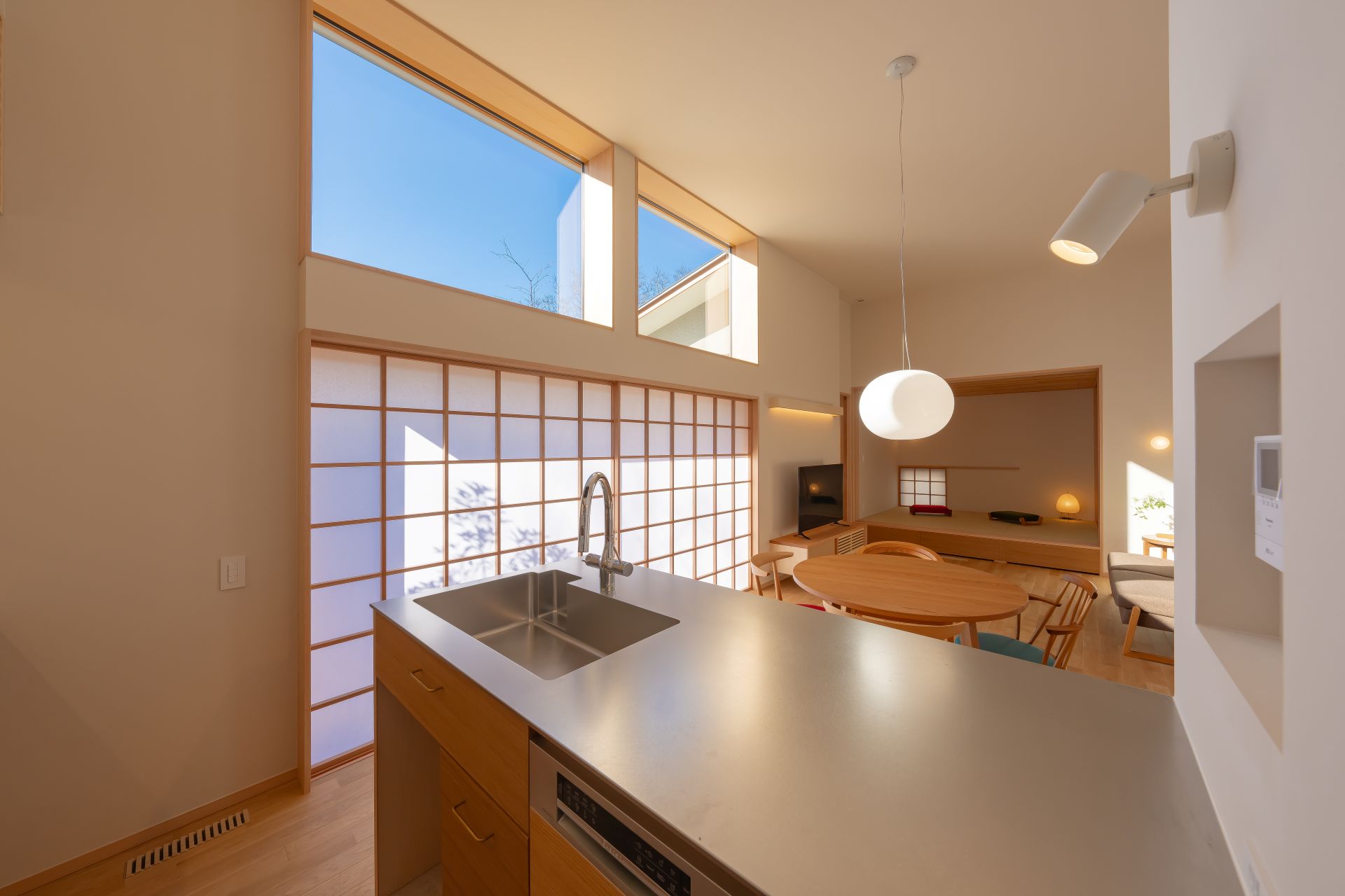 庭と繋がる開口の木製サッシの採用や、メリハリのある空間設計により、23坪とは思えない広々とした太陽光を活用できる空間設計に加え、床下エアコン、4.98kWの太陽光発電容量の他、