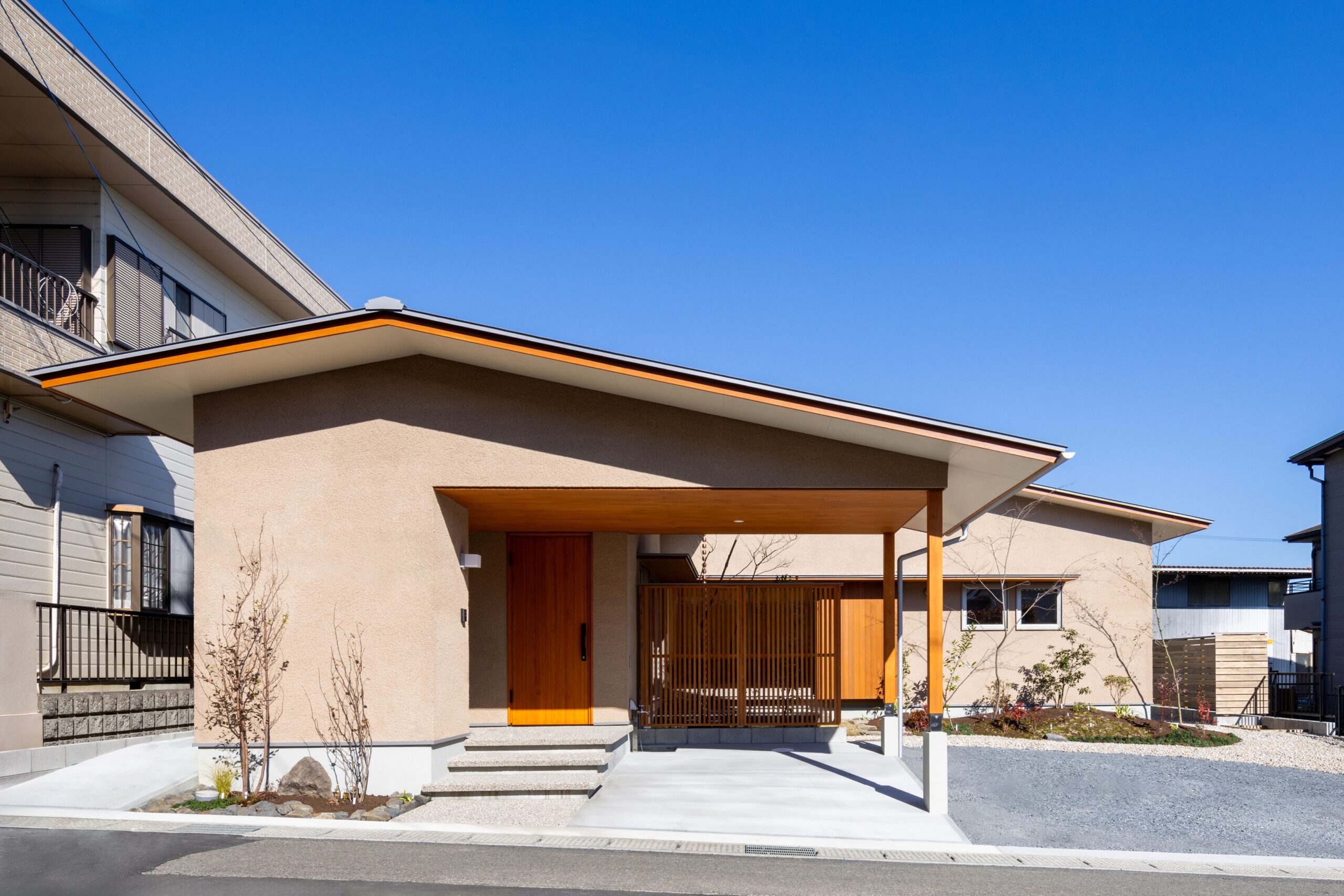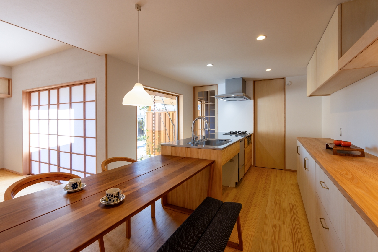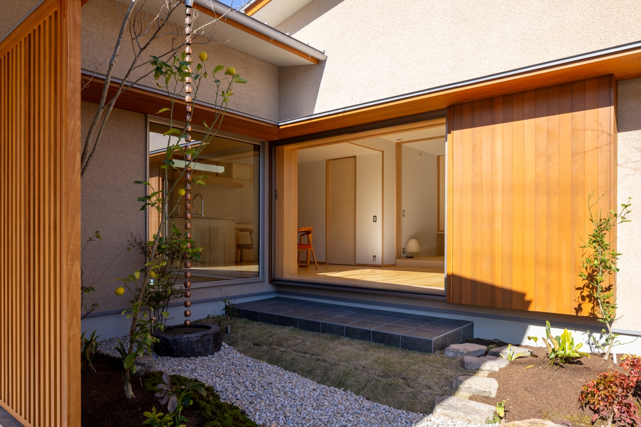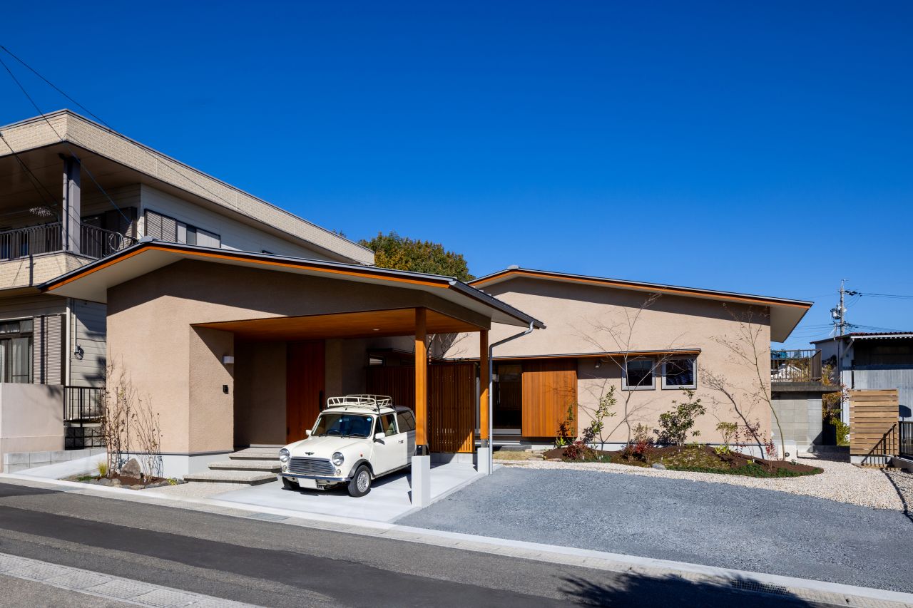 L字のLDKや、キッチンにある大容量の壁面収納、ガレージから室内への雨に濡れない動線、個室の造作家具などの暮らしやすさに満ちた室内のほか、塗り壁の洗練された外観が特徴です。