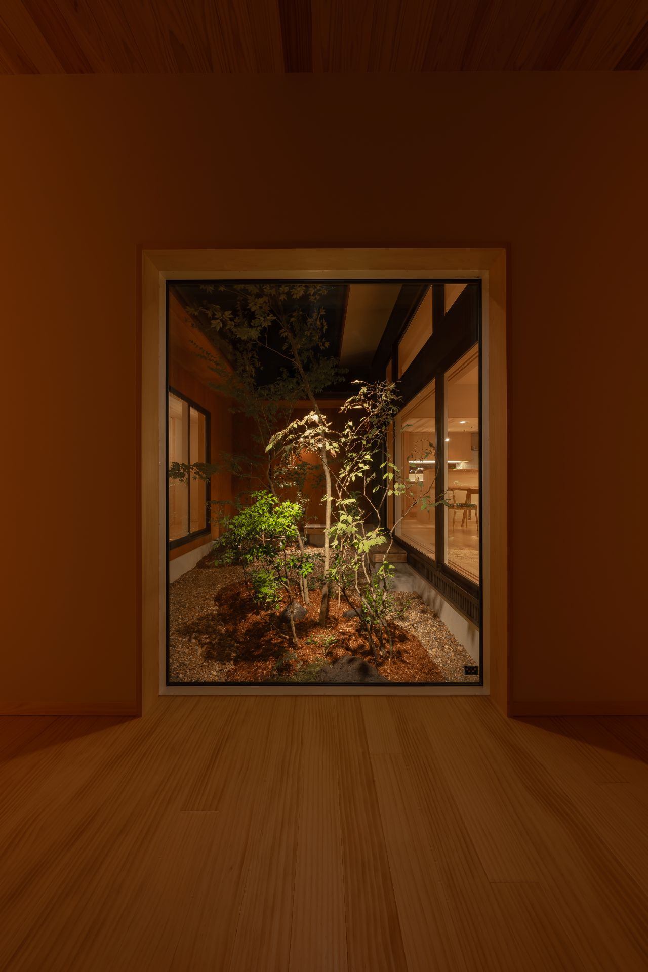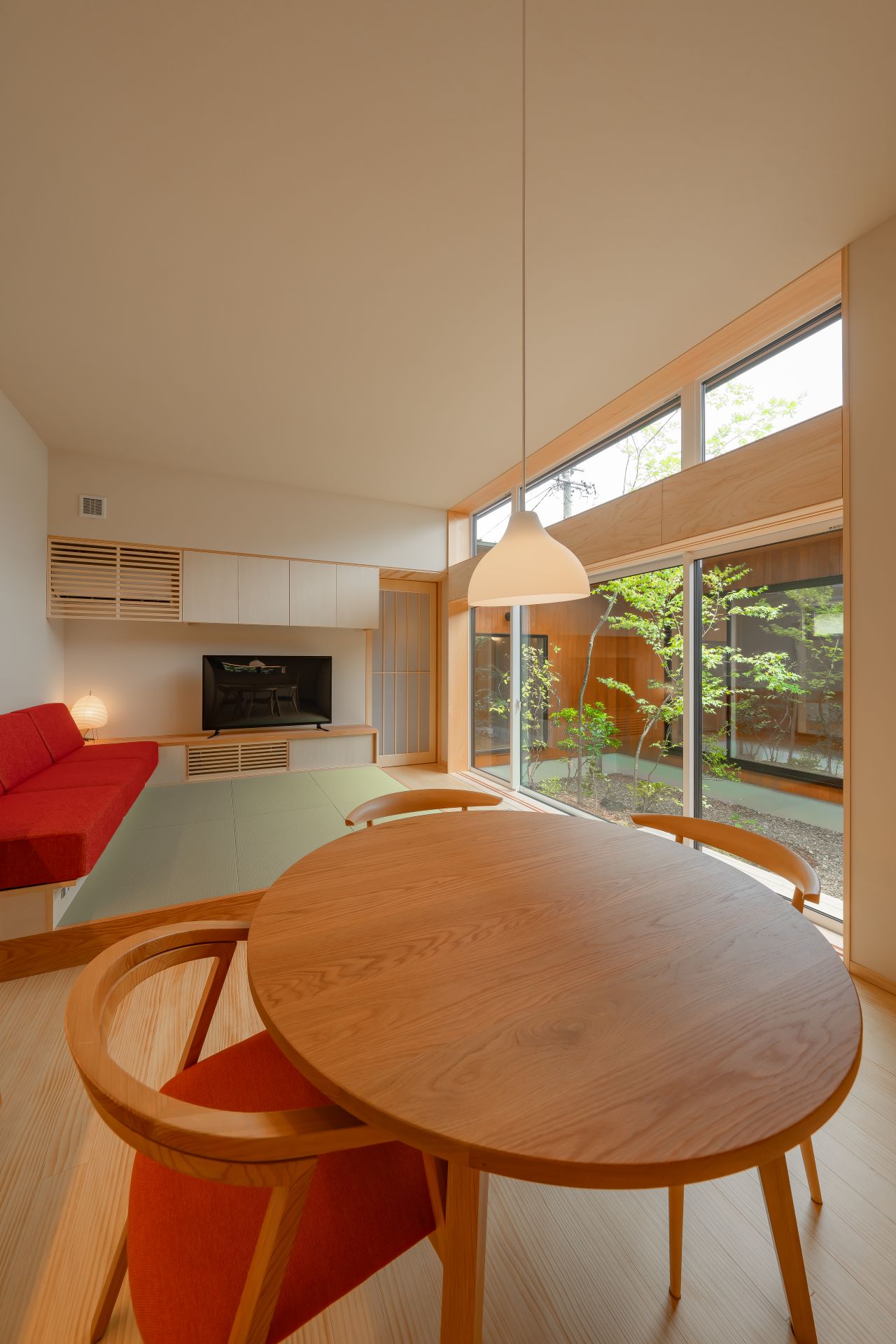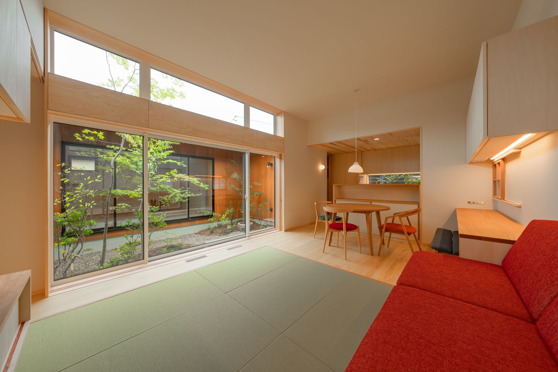 木々が植え込まれた中庭はプライバシーを重視しながらも、明るく、開放感を感じられる設計は、家族が心地よく過ごせる居住環境を提供します。